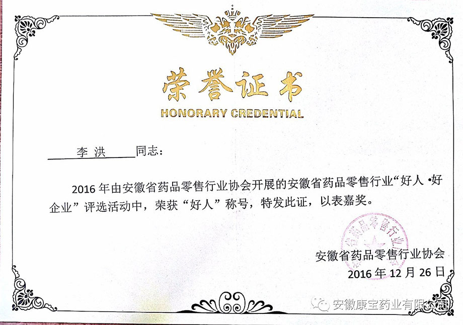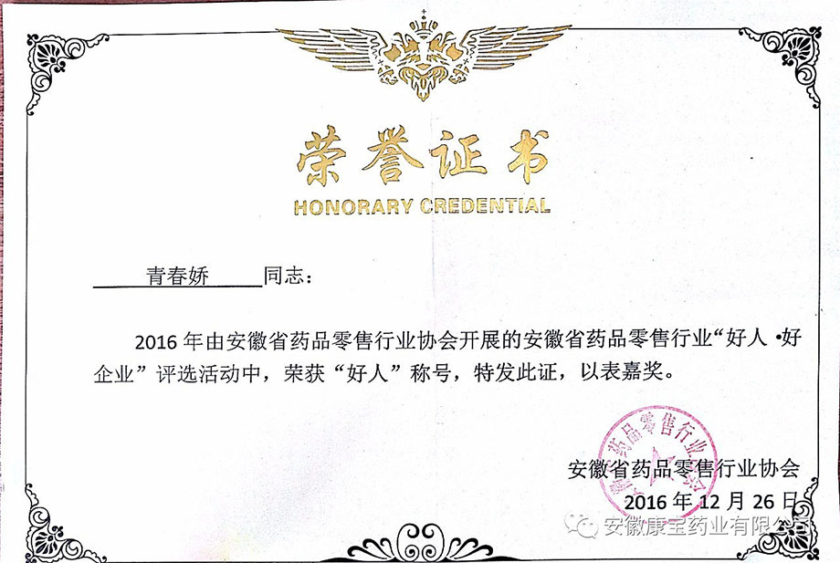 歲末好事不斷,康寶獲獎(jiǎng)連連。12月26日,由省藥品零售行業(yè)協(xié)會(huì)主辦的安徽省藥品零售企業(yè)“好人 好企業(yè)”頒獎(jiǎng)典禮在省城合肥隆重舉行。淮南東方醫(yī)院集團(tuán)全資子公司康寶藥業(yè)通過(guò)逐級(jí)推薦、層層考核、公開(kāi)評(píng)審等程序,最終被評(píng)為“好企業(yè)”稱(chēng)號(hào),康寶藥業(yè)員工青春嬌、李洪被評(píng)為“好人”稱(chēng)號(hào)。