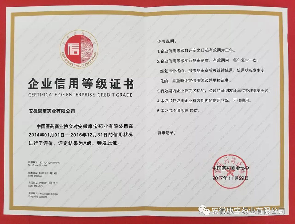 近日,中國醫(yī)藥商業(yè)協(xié)會在2017中國藥品流通行業(yè)年度大會上公布了“2017年中國企業(yè)信用等級評價”結(jié)果,最終有13家企業(yè)獲得評級認(rèn)定,安徽康寶藥業(yè)有限公司喜獲A級企業(yè)信用評級。