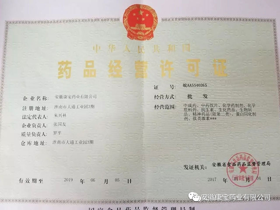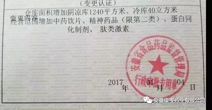1月4日,安徽省食品藥品監(jiān)督管理局正式將變更后的《藥品經(jīng)營許可證》、《藥品經(jīng)營質(zhì)量管理規(guī)范認(rèn)證證書》頒發(fā)給康寶藥業(yè),標(biāo)志著我公司順利通過“增加倉庫面積、擴(kuò)大經(jīng)營范圍”GSP專項(xiàng)認(rèn)證。
