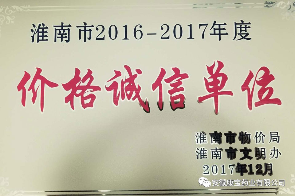12月28日,“淮南市2016-2017年度價(jià)格誠信單位表彰大會”在金茂酒店召開,安徽康寶藥業(yè)有限公司榮獲“2016-2017年度價(jià)格誠信單位”稱號。誠信康寶,情系健康。新的一年,挑戰(zhàn)和機(jī)遇并存,困難與希望同在。面對保持公司事業(yè)穩(wěn)步發(fā)展的重要使命,我們肩上的責(zé)任更重,我們的信心也更強(qiáng)。我們一定要不折不扣地按照醫(yī)院集團(tuán)的總體部署,腳踏實(shí)地地強(qiáng)化內(nèi)部管理,提高綜合素質(zhì),以飽滿的工作熱情和頑強(qiáng)的拼搏精神,通過我們更加科學(xué)的管理和更加精細(xì)的工作,將公司的事業(yè)全面推向前進(jìn)。全力打造出公司事業(yè)更加燦爛輝煌的明天!