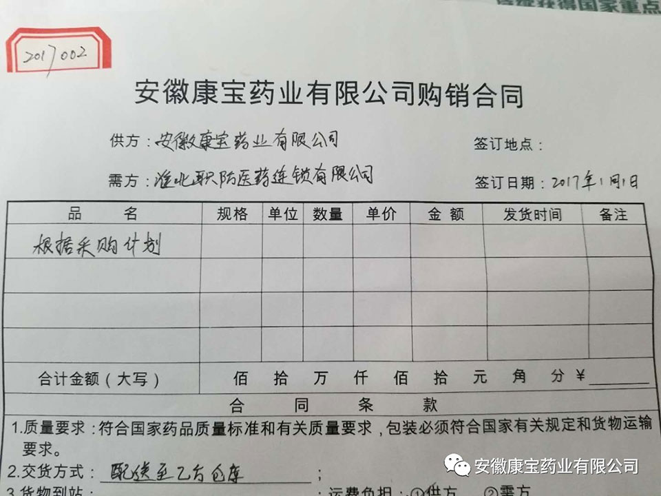 1月1日,康寶藥業(yè)與淮北職防醫(yī)藥連鎖有限公司簽訂購銷合同。