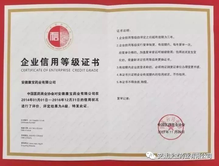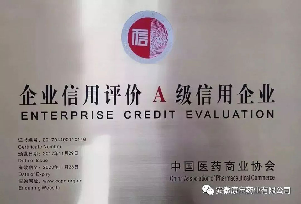 11月29日,中國醫(yī)藥商業(yè)協(xié)會在2017中國藥品流通行業(yè)年度大會上公布了“2017年中國企業(yè)信用等級評價(jià)”結(jié)果,最終有13家企業(yè)獲得評級認(rèn)定,安徽康寶藥業(yè)有限公司喜獲A級企業(yè)信用評級。