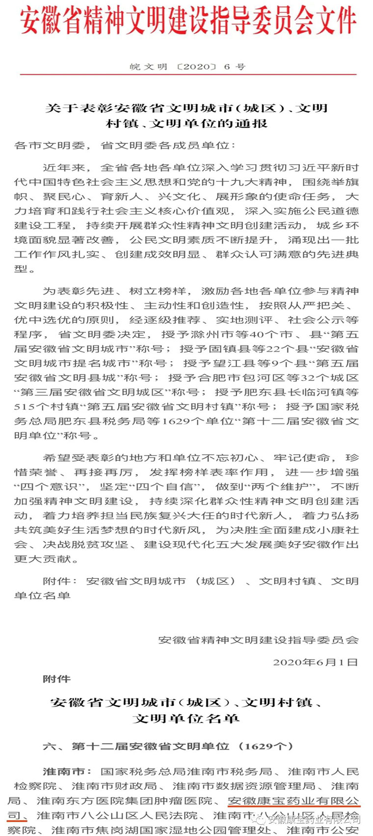 近日,淮南東方醫(yī)院集團全資子公司--安徽康寶藥業(yè)有限公司被安徽省精神文明建設指導委員會授予“第十二屆安徽省文明單位”稱號,這是康寶藥業(yè)繼獲得第十七屆、第十八屆淮南市文明單位之后的又一標志性文明單位創(chuàng)建成果,也是康寶藥業(yè)首次收獲省級文明單位創(chuàng)建碩果。