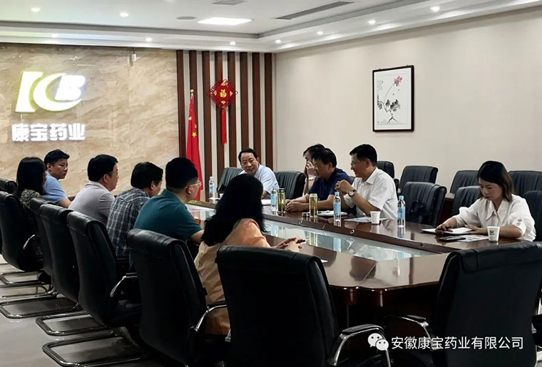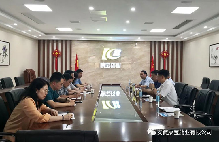 6月23日上午,淮南市政府副秘書長聶友俠、淮南市商務局局長梁廣賢、淮南市大通區常務副區長明冠雷、淮南市市場中心主任童志友、大通區商務局副局長江萍,來到康寶藥業走訪調研。康寶藥業董事長朱興林熱情接待了各位領導并陪同調研。