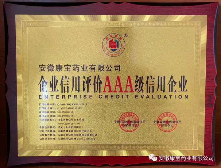 近日,安徽企業信用等級評價專家委員會公布了2020年“AAA級信用企業”評選結果,安徽康寶藥業有限公司喜獲“AAA級信用企業”榮譽稱號,為最高信用等級。